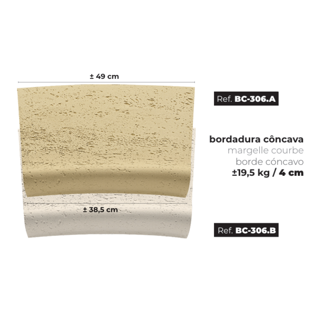 Bordadura côncava para piscinas, 48×40 cm, com acabamento tipo travertino. Resistente, segura e decorativa.