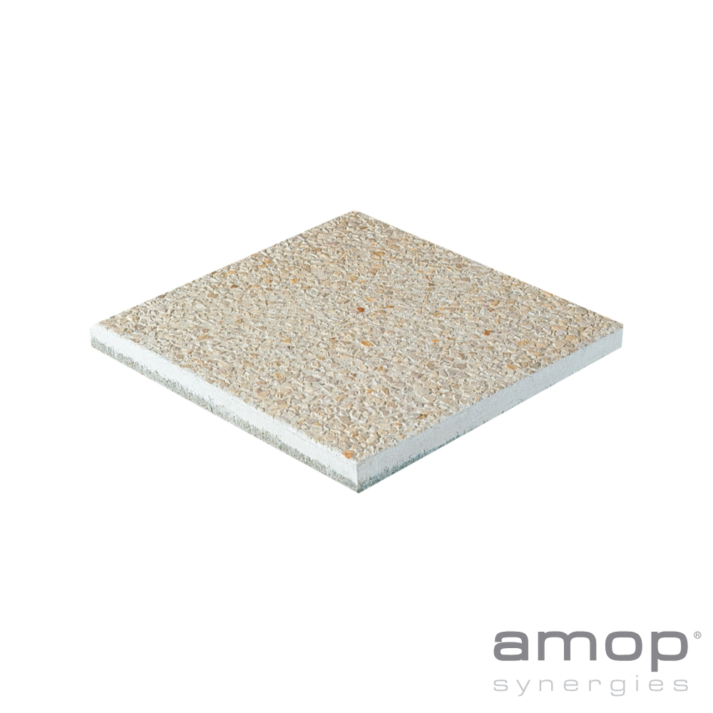 Lajeta lavada, para pavimentos exteriores, com superfície de agregado britado à vista, de tonalidade ideal para praças, passeios, caminhos, terraços e pátios.