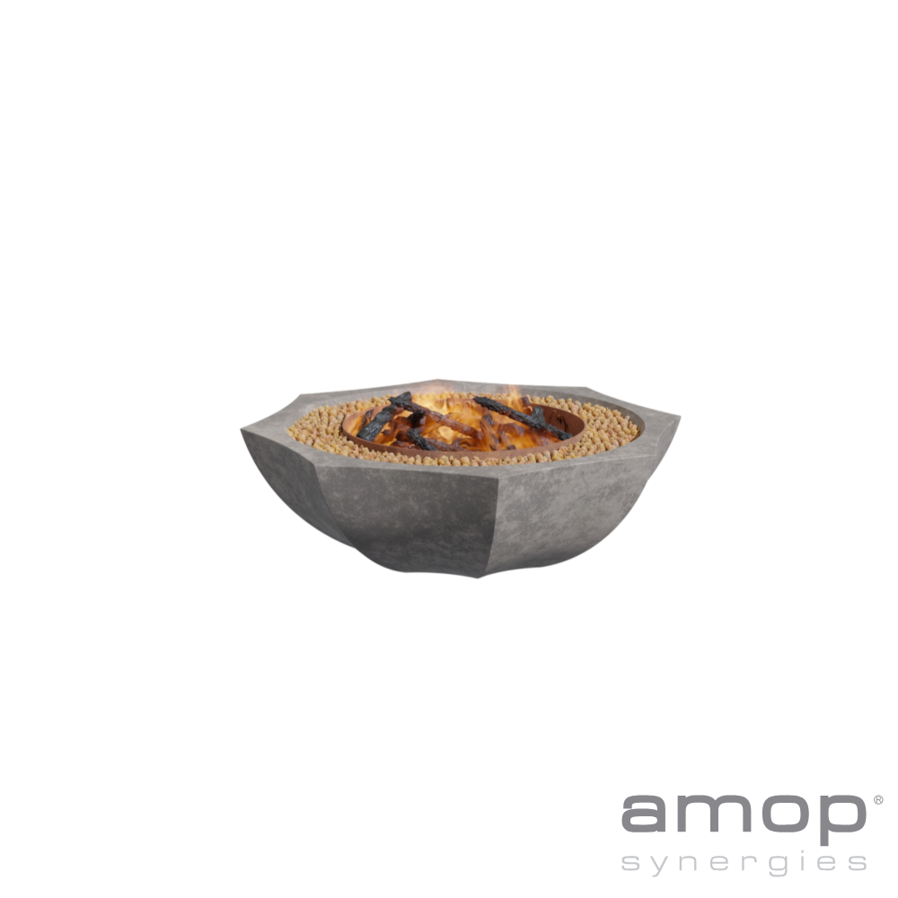 Lareira M com Queimador em Corten e Argila Espandida, Fabricada em Betão Refractário Cinza – Lenha / Carvão