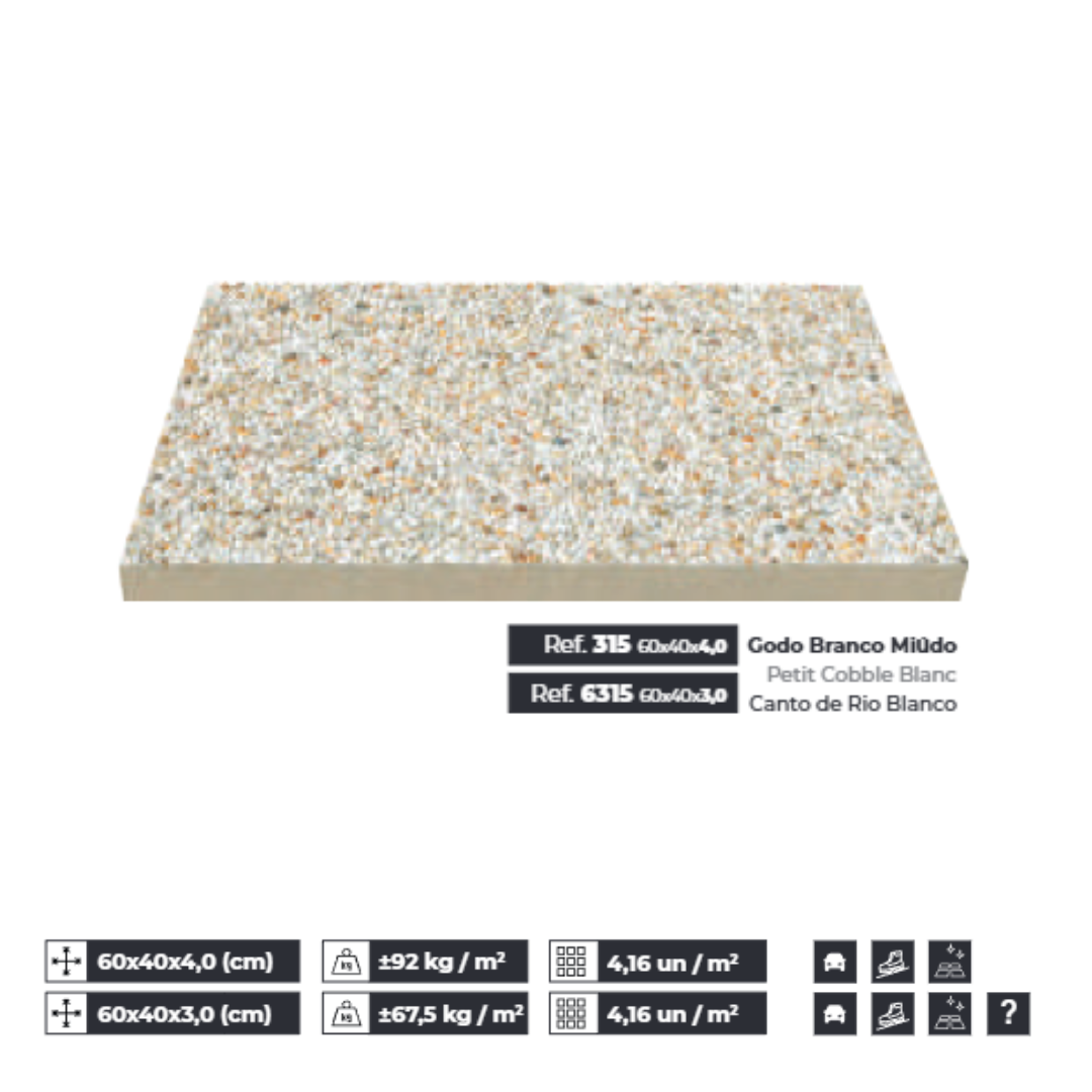Placa de godo miúdo seixo branco, com acabamento natural e elegante.Oferece elevada resistência e durabilidade, ideal para pavimentos exteriores e zonas de circulação.