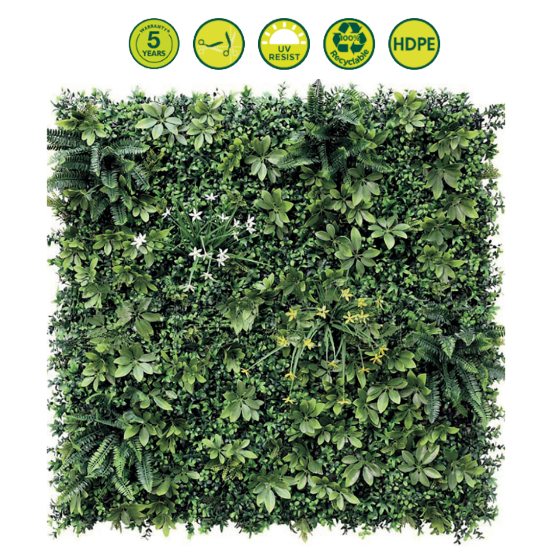 Para criar uma atmosfera natural, decorar uma parede tanto ao ar livre quanto em ambientes internos, para trazer uma atmosfera vegetal sempre verde. Fácil de instalar, altamente resistente, sem restrições de manutenção. l.