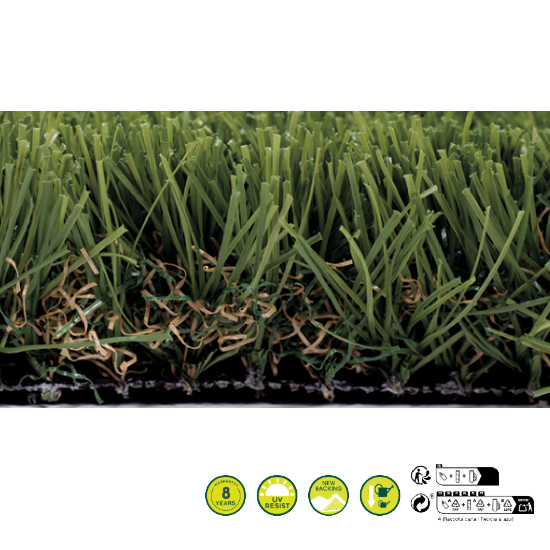 Relva artificial com recuperação após pisoteio. Fabricado em fibra monofilamento côncava com um nervo interno que lhe confere uma grande capacidade de memória. Seus resistentes fois bicolores lhe outorgam um aspecto muito natural, dificultando diferencia-lo da relva natural.